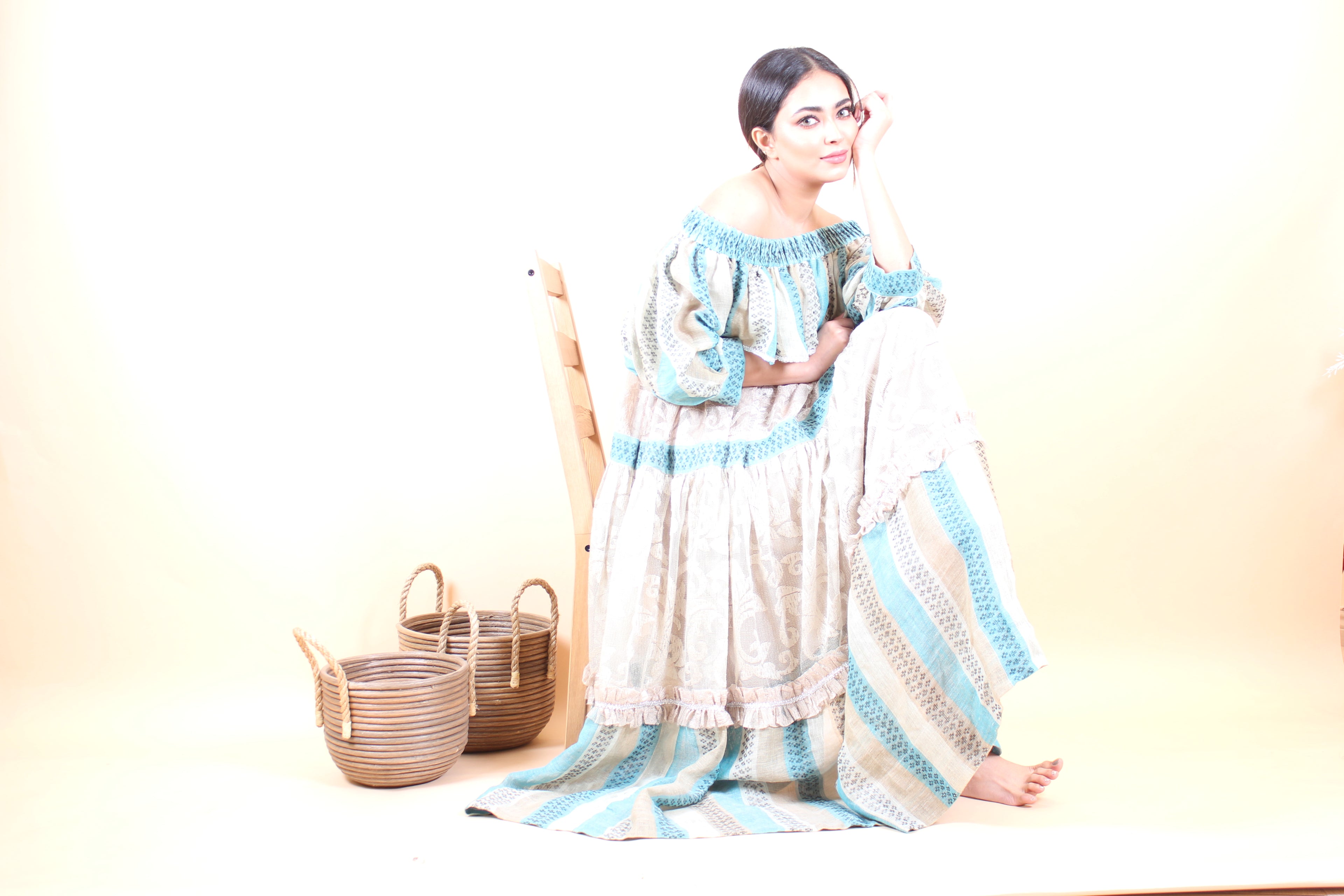 Floral Cotton -Linnen Kaftan with Pom-Poms, Free Size